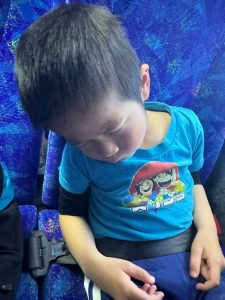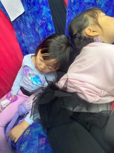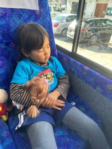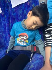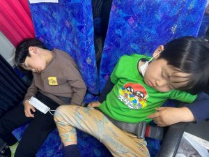 帰りのバスでは、やはりたくさん遊んで疲れて寝る子も続出。