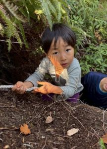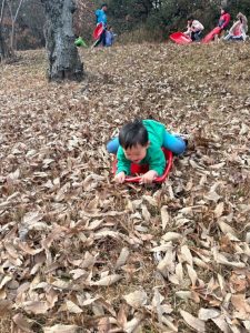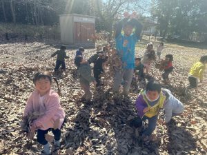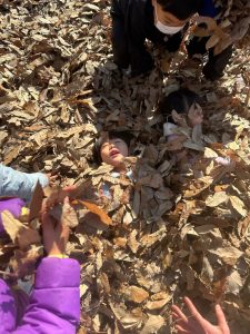 そして、男の子を女の子達が落ち葉で埋めていきます。