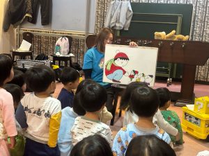 夜のリクリエーション大会は、音楽に合わせてぐるぐる回ったり、椅子取りゲームをしたり、かっくんの紙芝居を観たり、こっこ先生の若返りタイム風呂敷のマジックを楽しみました。