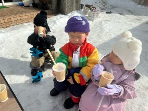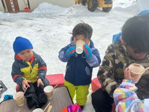 そんな時は、あったかい『ココア』『いちごみるく』の美味しい飲み物をこびっきー先生が作ってくれました。
