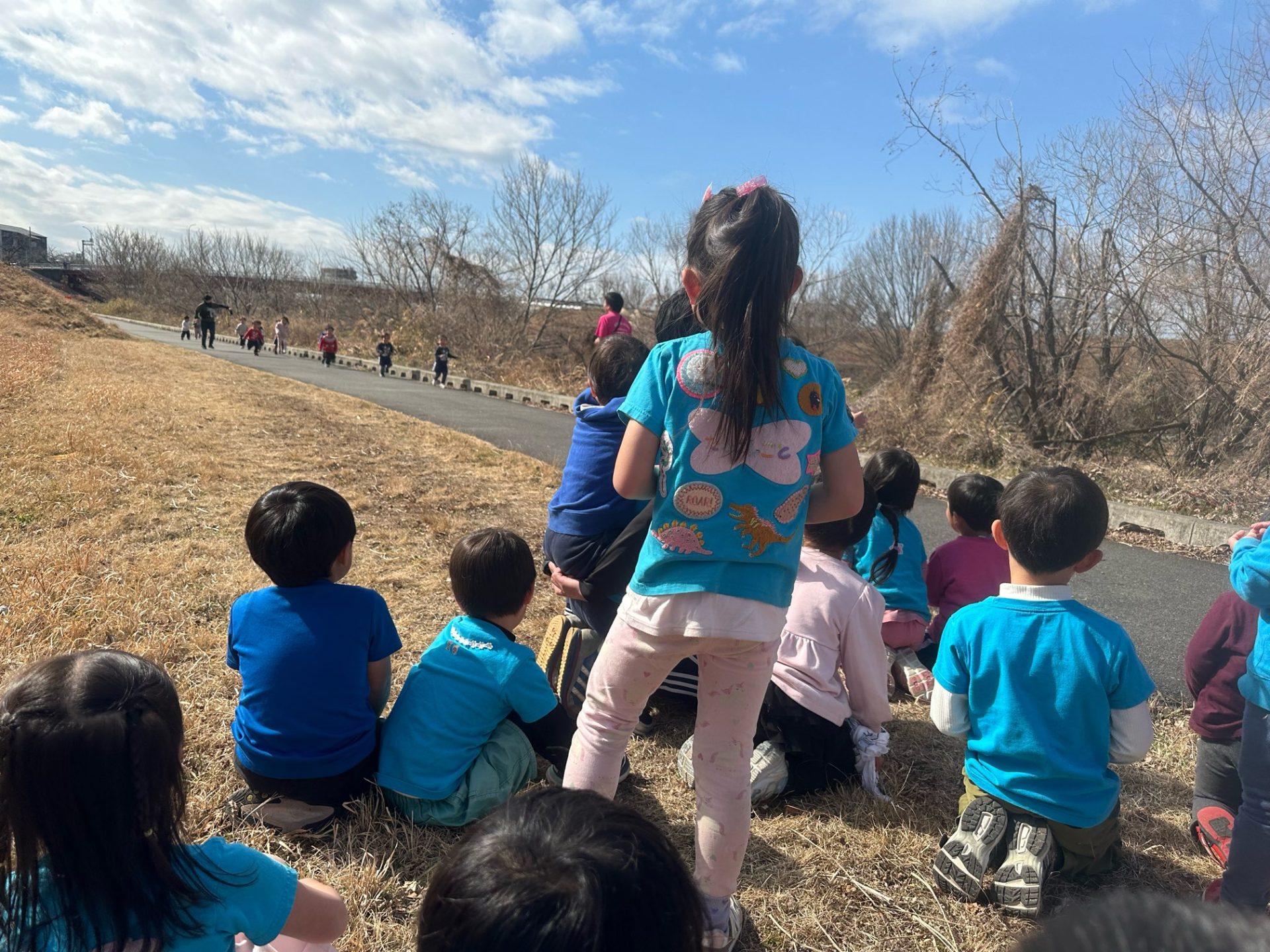 自然と集まる子どもたち、、、そして自然と2列で集合、、、