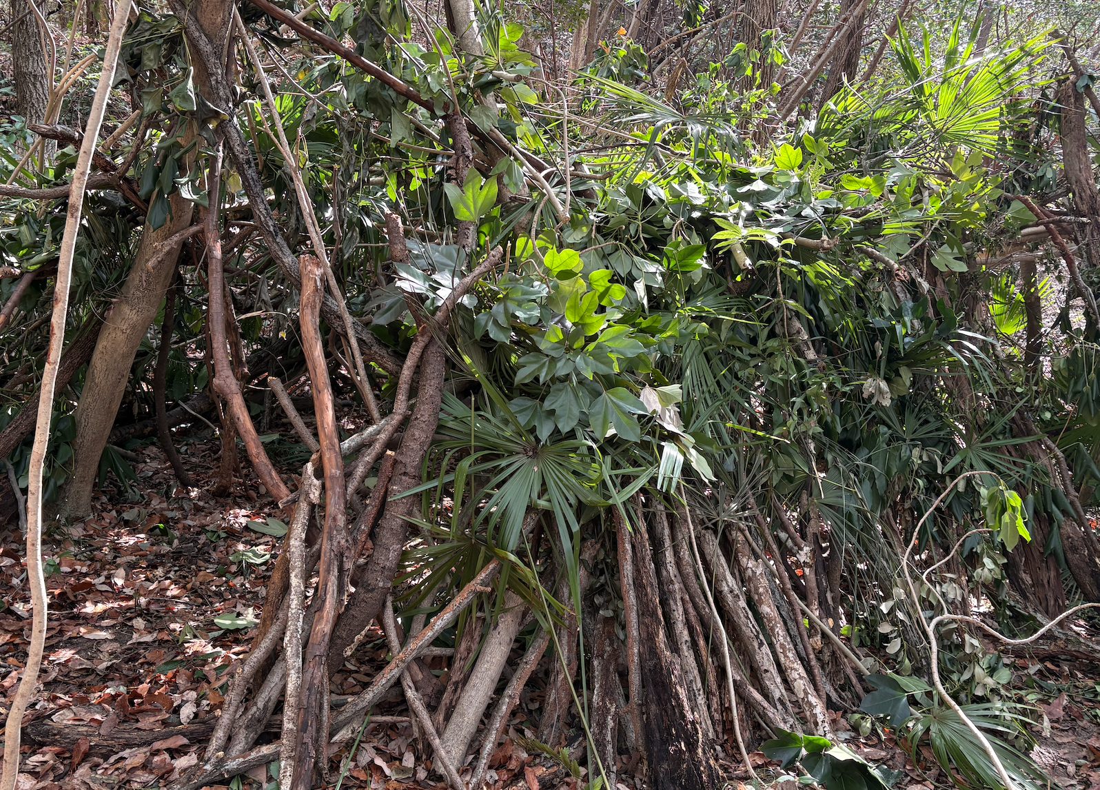 雨も凌げるような屋根を作ることが今回の目標。内側からもしっかり葉っぱで覆い尽くします。