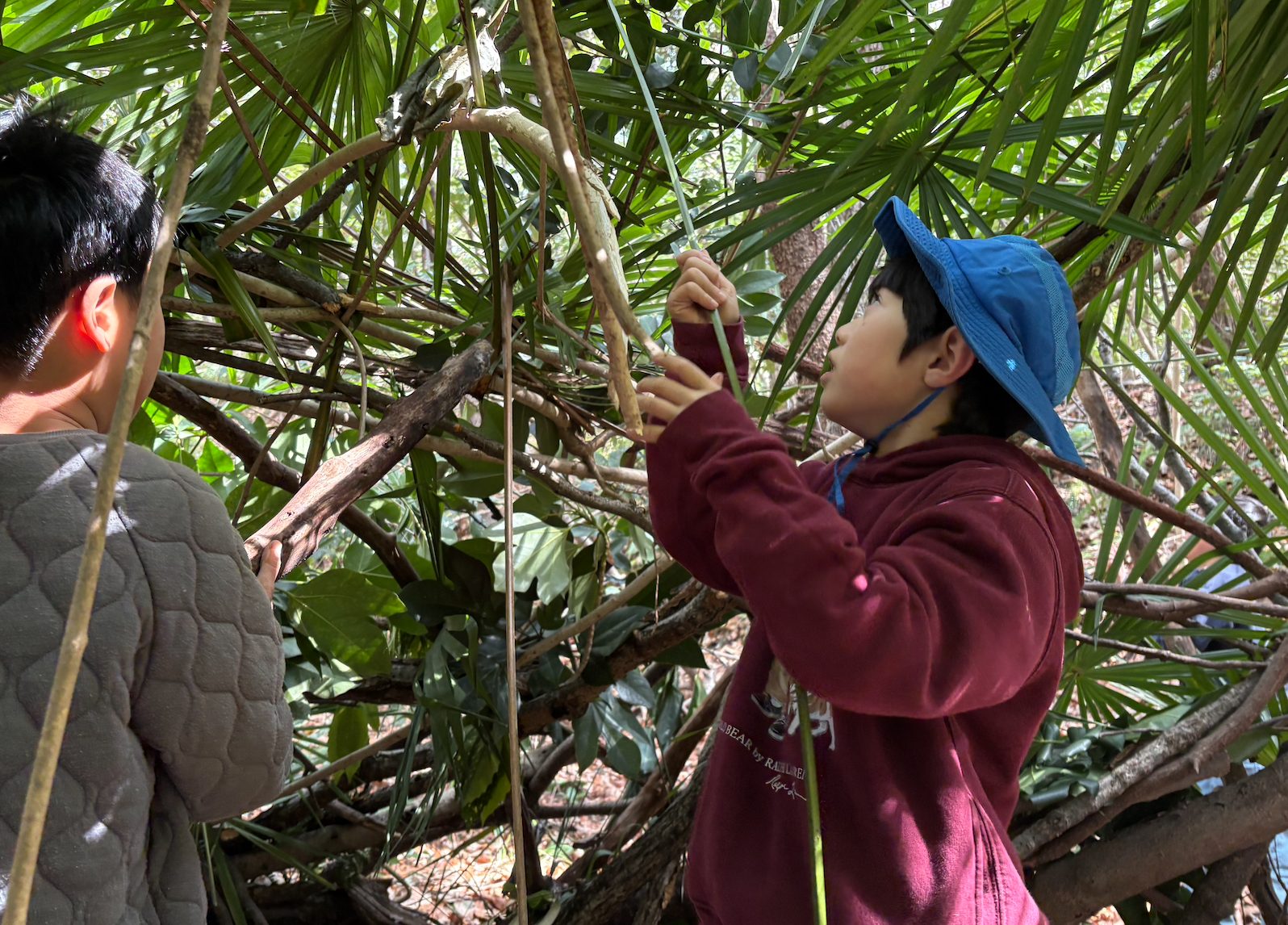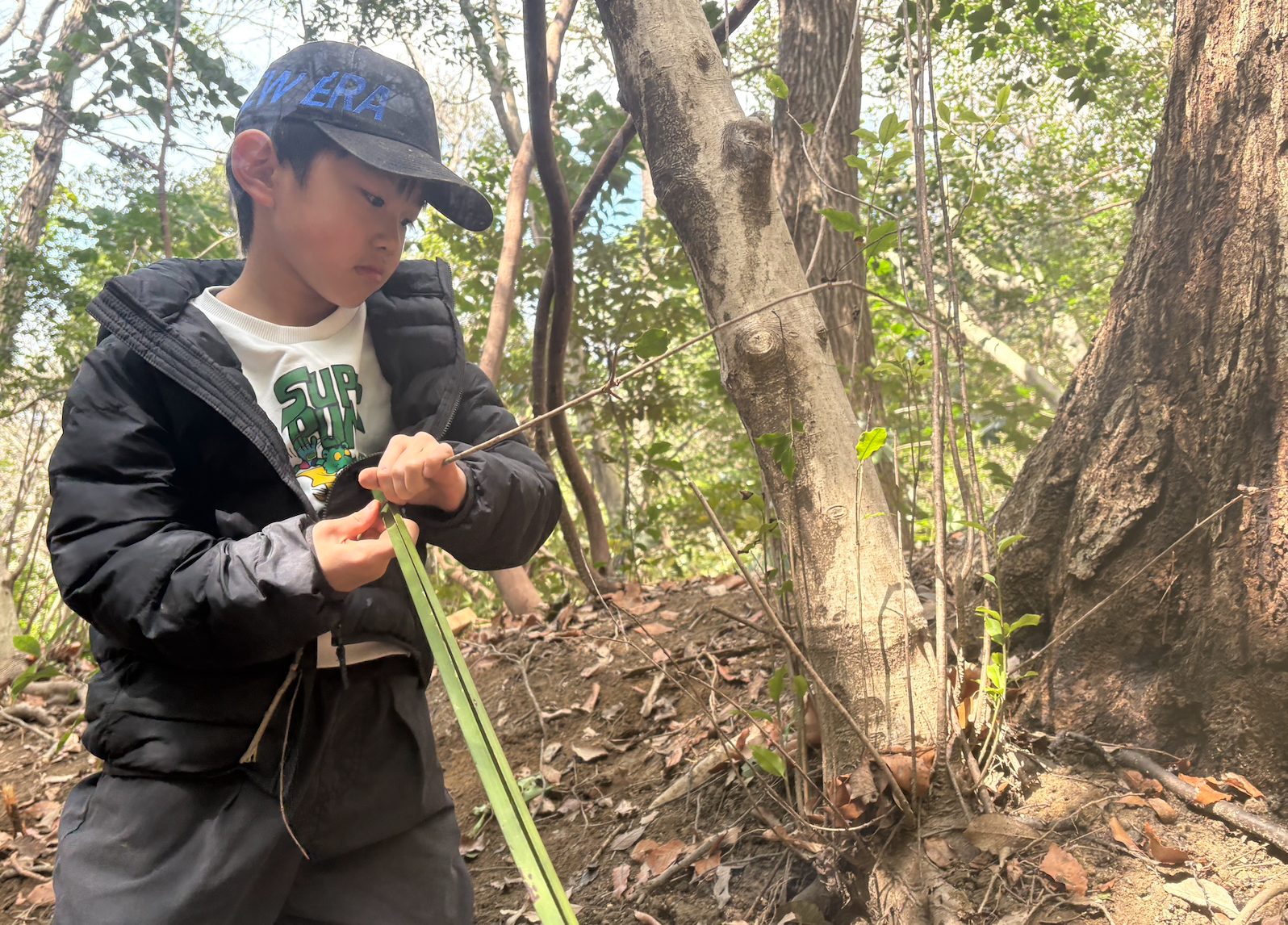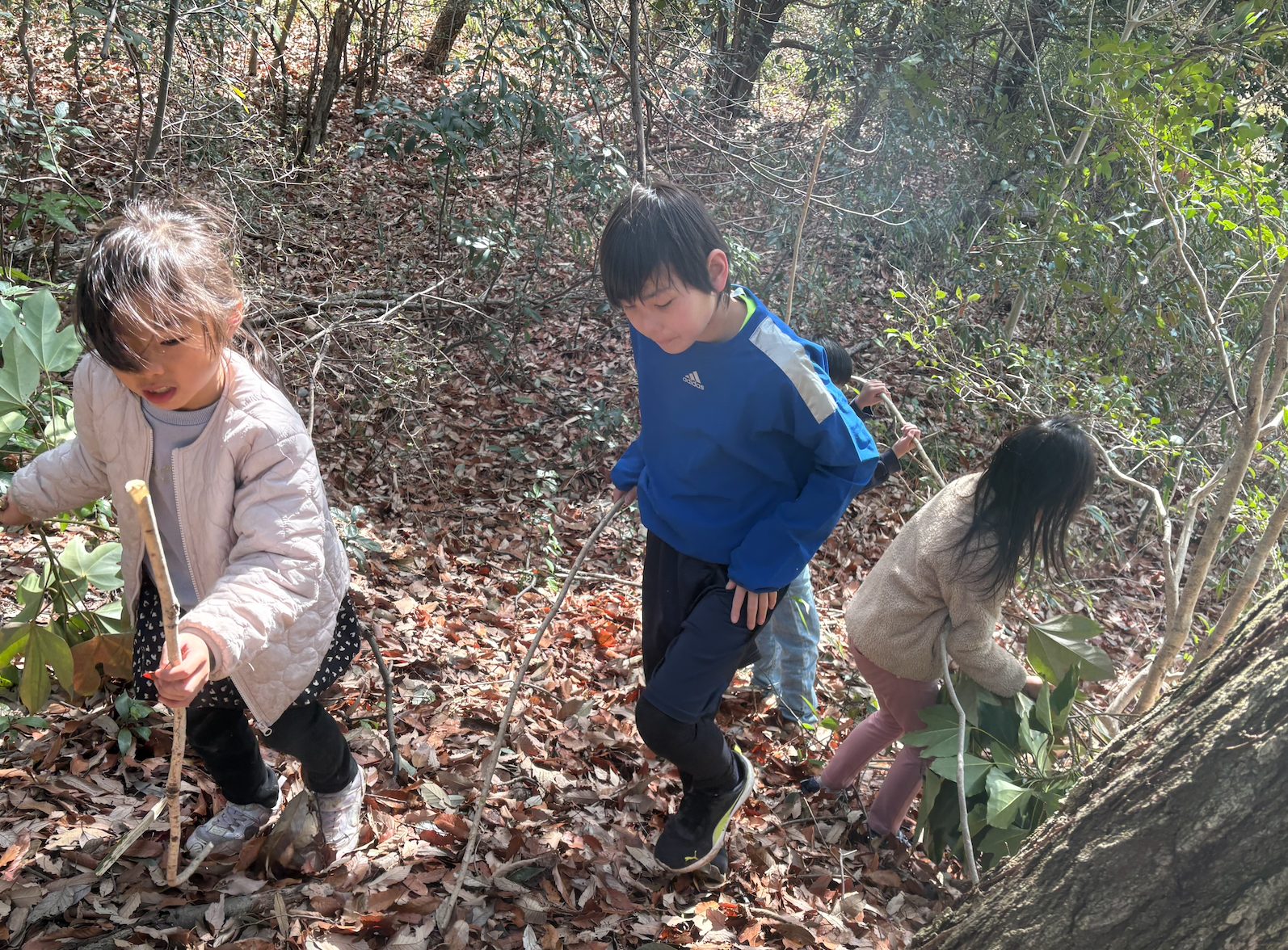 木を集めるチーム、葉っぱを集めるチーム、集めたもので秘密基地を強化していくチーム。それぞれに分かれて秘密基地づくりスタート!
