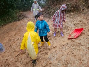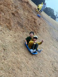 ある男の子が「せんせ~しばふはあめだとすべらないよ!」
