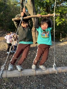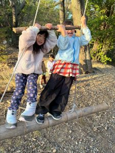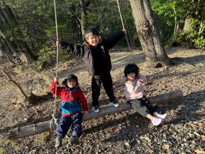 落ち葉風呂で温まった後は、先生お手製のブランコに乗ったよ!