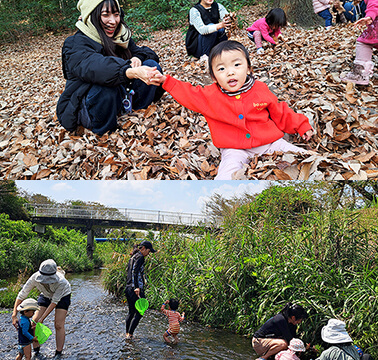 葉っぱを拾ったり、坂をのぼったり、川に手を入れたり…自然は遊び場がいっぱい!